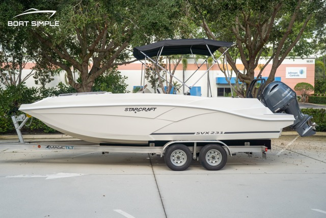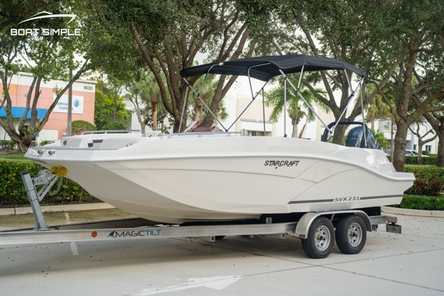 The 2023 Starcraft SVX 232 OB DH is the ultimate family deck boat, delivering premium comfort, space, and performance in one sleek package. At 23 feet long, this dual helm model offers ample seating and lounging areas, including a wraparound bow, a spacious stern, and dual captain’s chairs—perfect for entertaining or relaxing on the water. Premium marine-grade upholstery, soft-touch flooring, and a user-friendly helm design elevate the onboard experience, while thoughtful details like built-in cupholders, a ski tow, and a freshwater sink make it ideal for full-day adventures. Powered by a reliable Yamaha outboard engine, the SVX 232 OB DH delivers smooth handling and confident performance, whether you're cruising the intracoastal or pulling a tube. With a deep-V hull design for a stable, dry ride and plenty of storage throughout, this boat is both practical and fun. Whether you're headed out with the whole crew or enjoying a quiet sunset cruise, the 2023 SVX 232 OB DH checks every box for boaters who want versatility and style.